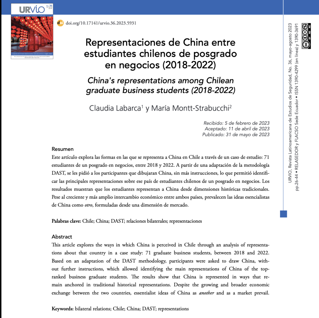 This article explores how China is represented in Chile through a case study: 71 students with a postgraduate degree in business, between 2018 and 2022. Based on an adaptation of the DAST methodology, participants were asked to draw China, without further instructions, which allowed identifying the main representations about that country of Chilean students of a postgraduate degree in business. The results show that students represent China from traditional historical dimensions. Despite the growing and broader economic exchange between the two countries, essentialist ideas of China as other, formulated from a market dimension, prevail.