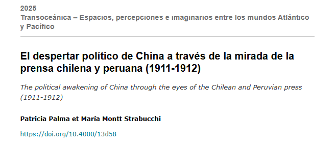 Abstract: This article analyzes the coverage of the Chinese Revolution in Chile and Peru through various newspapers and magazines published both in the capitals of both countries (Lima and Santiago) and in cities where important Chinese communities resided, such as Arequipa, Tacna, Arica, and Iquique. This revolution, which took place between October 1911 and February 1912 and ended the Qing dynasty, giving rise to the Republic, aroused great interest from Chilean and Peruvian print media. The circulation of news and images about China that arrived from abroad and were reproduced in local media allowed readers to learn about and, as will be analyzed, complexify the image that local readers had regarding this nation and its inhabitants. We argue for the existence of contradictory discourses regarding China and the Chinese residents in local spaces, as while the analyzed media praised China's modernity, the fierceness of its leaders and subjects, these same outlets were spokespersons for a strongly racialized discourse against Chinese immigration and their presence in the Americas.