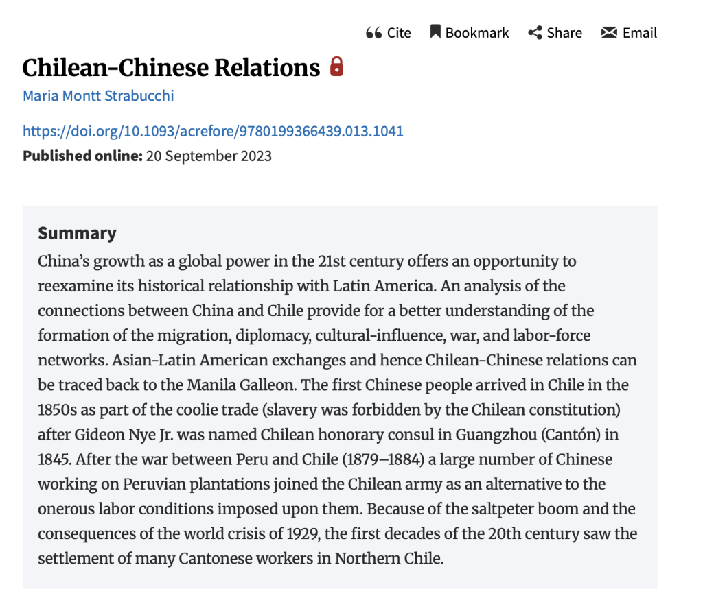 China’s growth as a global power in the 21st century offers an opportunity to reexamine its historical relationship with Latin America. An analysis of the connections between China and Chile provide for a better understanding of the formation of the migration, diplomacy, cultural-influence, war, and labor-force networks. Asian-Latin American exchanges and hence Chilean-Chinese relations can be traced back to the Manila Galleon. The first Chinese people arrived in Chile in the 1850s as part of the coolie trade (slavery was forbidden by the Chilean constitution) after Gideon Nye Jr. was named Chilean honorary consul in Guangzhou (Cantón) in 1845. After the war between Peru and Chile (1879–1884) a large number of Chinese working on Peruvian plantations joined the Chilean army as an alternative to the onerous labor conditions imposed upon them. Because of the saltpeter boom and the consequences of the world crisis of 1929, the first decades of the 20th century saw the settlement of many Cantonese workers in Northern Chile.