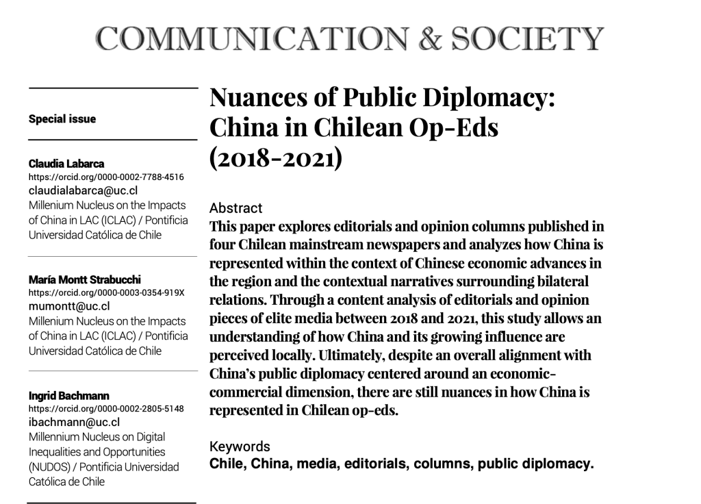 This paper explores editorials and opinion columns published in four Chilean mainstream newspapers and analyzes how China is represented within the context of Chinese economic advances in the region and the contextual narratives surrounding bilateral relations. Through a content analysis of editorials and opinion pieces of elite media between 2018 and 2021, this study allows an understanding of how China and its growing influence are perceived locally. Ultimately, despite an overall alignment with China’s public diplomacy centered around an economic-commercial dimension, there are still nuances in how China is represented in Chilean op-eds.-