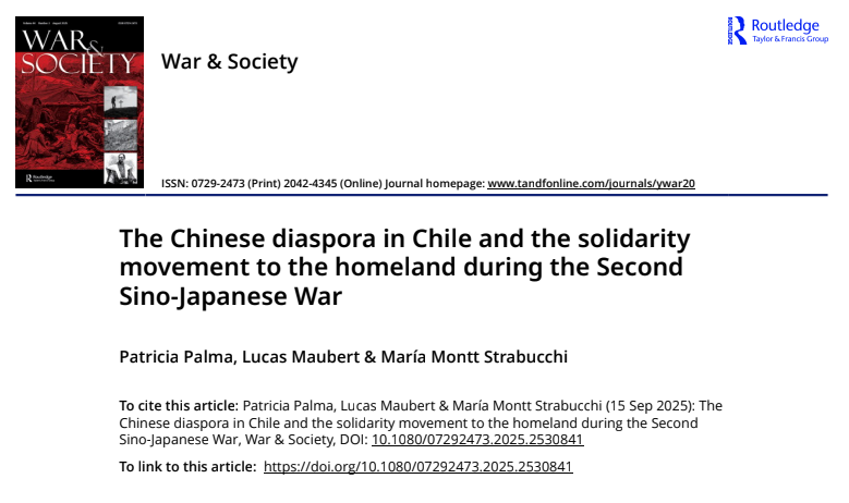 Resumen: The Second Sino-Japanese War (1937–1945) mobilised Chinese communities overseas, even in countries located thousands of kilometres from Asia. This article explores the actions of the Chinese community in Chile in their efforts to support China, collect donations, and influence public opinion in favour of their cause and against Japan. Focusing on the city of Iquique during 1938, the most intense year of solidarity activities, we argue that the Sino-Japanese War allowed the Chinese community to unite and garner sympathy in a local context previously marked by nationalism and hostility toward Asian immigrants. Therefore, we estimate that the Chinese overcame the Japanese in the ‘local war’ between these two Asian migrant communities, shifting public opinion in their favour.
