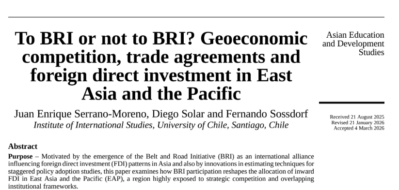 Originality/value – 1. Conceptualizing the BRI as a distinct institutional modality based on geopolitical signaling and coordination, rather than as a substitute or extension of rules-based trade agreements. 2. Empirically testing whether BRI effects on inward FDI persist once PTAs are explicitly controlled for, rather than assuming complementarity or substitution. 3. Documenting systematic heterogeneity across income-pair types, with effects concentrated in South–South investment relationships within a single, geopolitically salient region (EAP).